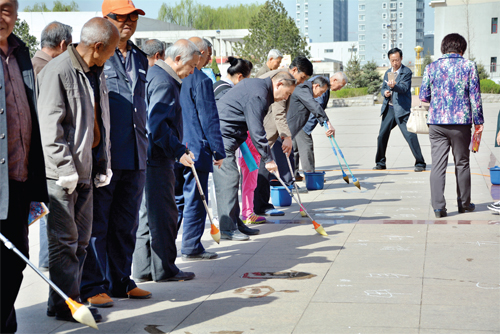 近日,定襄縣委老干局和縣老年書畫研究會組織該縣50余名書法愛好者在金鼎文化廣場開展了以“匯聚正能量、展示新精神”為主題的社會主義核心價值觀地書活動。活動旨在倡導(dǎo)和弘揚(yáng)社會主義核心價值觀基本內(nèi)容和普及推廣“地書“文化。(張玉虎 攝)