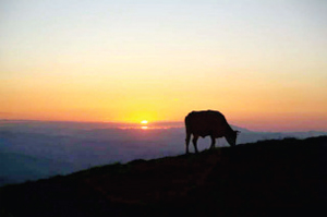 南臺(tái)也被稱為花臺(tái),各種野花競(jìng)相開放,清新雅致。遠(yuǎn)眺峰巒疊嶂,漸入云端,近觀,地上完全鋪上了綠毯,牛馬自在地曬著太陽(yáng)吃著美味肥草。南臺(tái)景色優(yōu)美,但師傅們很清苦,夏天也身穿棉袍,因?yàn)樗聫R里比較陰冷。山上缺水,終年靠接雨水喝為生。我們坐著朋友的紅色越野車下山,擺出各種pose,留下了與綠地、藍(lán)天、白云、奶牛在一起的絕美畫面。
