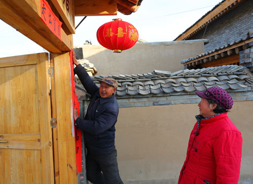 除夕早上,岢嵐縣宋家溝移民新村,沈姚付兩口子正在貼春聯(lián)迎新春。張林平 攝 |