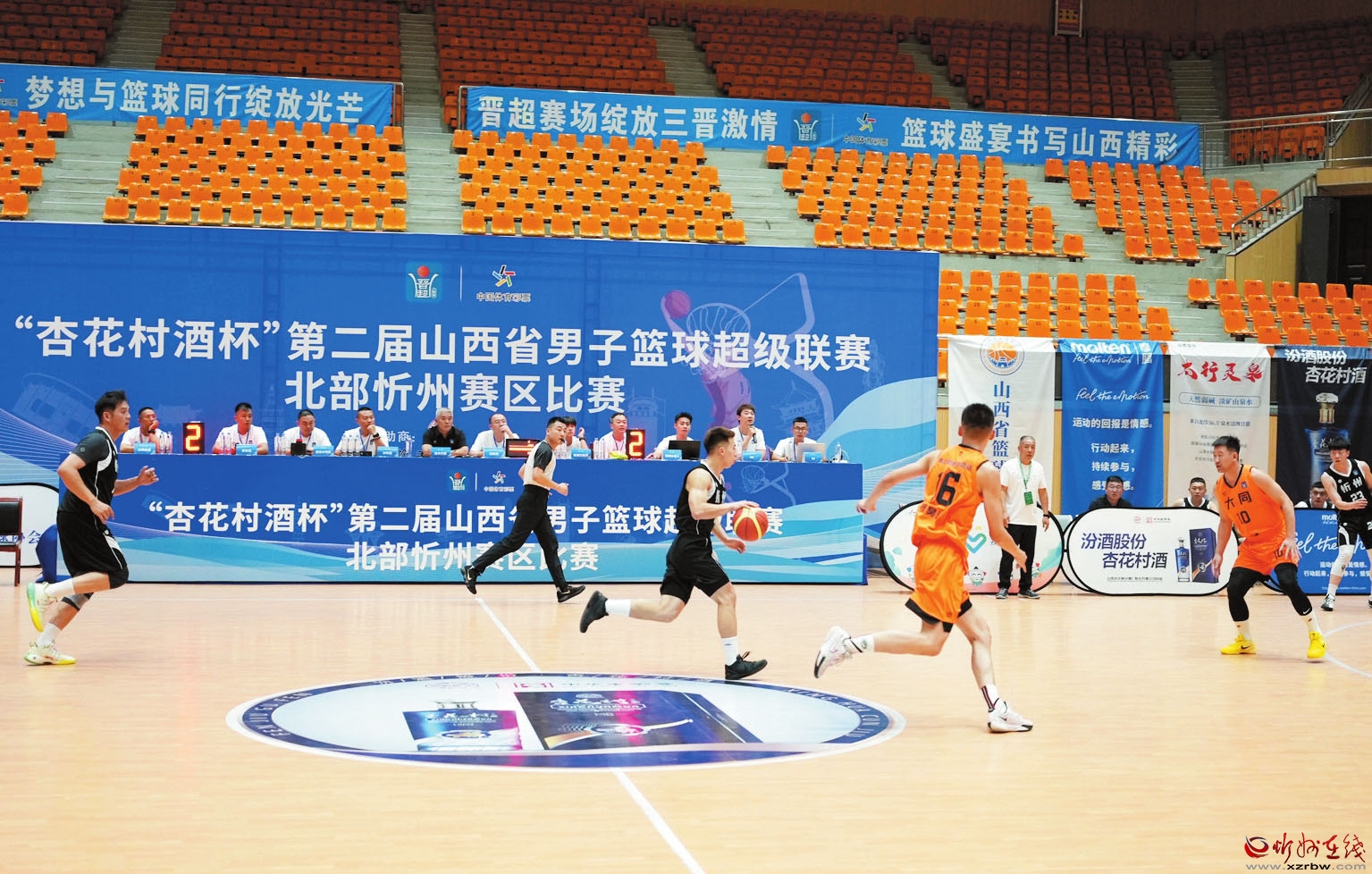 8月7日至9日,“杏花村酒杯”第二屆男子籃球超級聯(lián)賽北部忻州賽區(qū)的精彩賽事在跤鄉(xiāng)體育館火熱開展。忻州市公安局代表隊作為主場隊伍,接連迎戰(zhàn)晉中市代表隊與大同市代表隊,為現(xiàn)場觀眾奉獻了兩場極具觀賞性的籃球盛宴。圖為比賽現(xiàn)場。(吳杰攝)