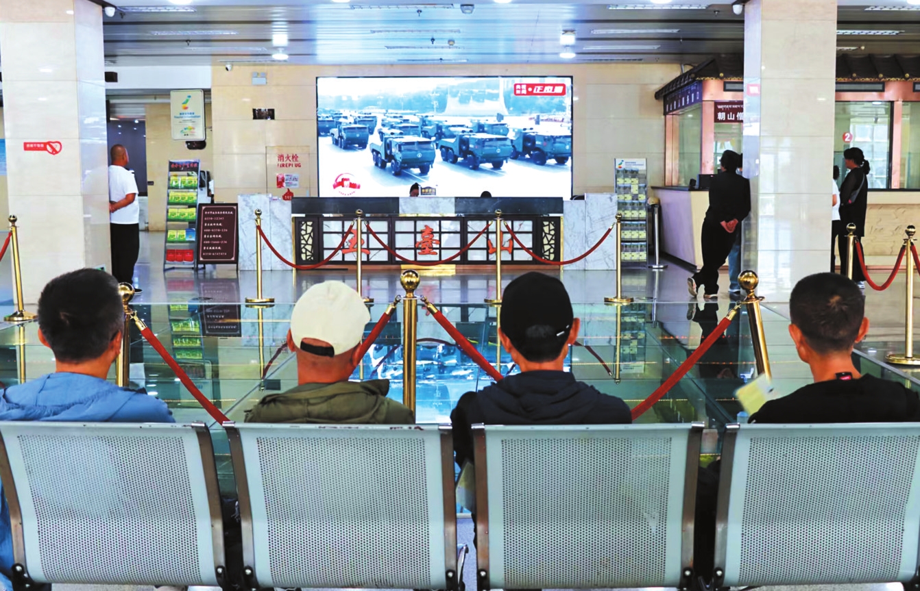 五臺(tái)山景區(qū)游客服務(wù)中心大廳,游客正在觀看紀(jì)念大會(huì)。張睿容攝