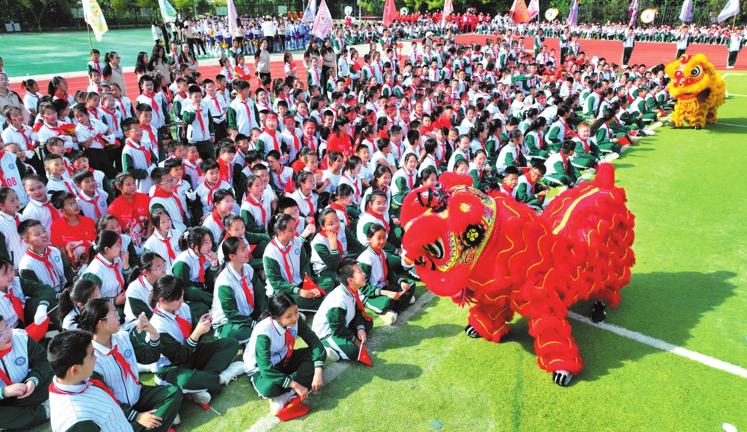 9月28日,忻州市長征小學西校區(qū)舉行第二屆秋季田徑運動會。圖為開幕式上孩子們與“獅”互動。(