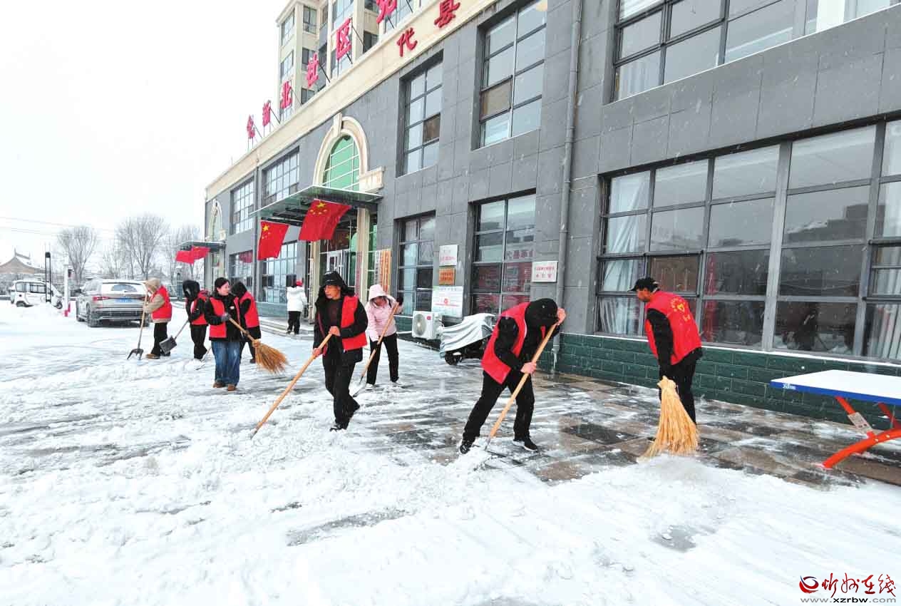 代縣新時代文明實踐中心工作人員在新北社區(qū)鏟雪。 高俊偉 劉 睿攝圖