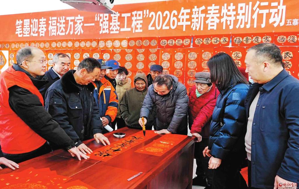 新春將至,年味漸濃。近日,由五寨縣文聯(lián)聯(lián)合縣總工會、團(tuán)縣委舉辦的“筆墨迎春福送萬家”送春聯(lián)活動(dòng)走進(jìn)李家坪鄉(xiāng)李家坪、張家坪村,以筆墨為媒傳遞新春祝福,用文化服務(wù)筑牢基層精神根基,讓“強(qiáng)基工程”的溫暖觸角延伸至鄉(xiāng)村一線。(劉篤效攝)