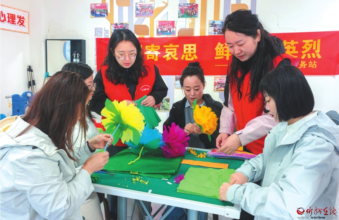 清明寄哀思,文明樹(shù)新風(fēng)。定襄縣南城社區(qū)組織工作人員與社區(qū)居民手工制作祭祀花,并免費(fèi)向社區(qū)居民發(fā)放,引導(dǎo)大家摒棄燒紙陋習(xí),以環(huán)保、溫情的方式追思先人。圖為社區(qū)工作人員與居民一同制作手工祭祀花。 (郭婧蕾攝)