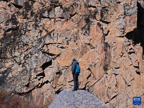 10月21日,陳雪松在實(shí)地調(diào)查海子山老林溝拉托扎巖畫。該處巖畫位于海子山南側(cè)老林溝內(nèi),巖畫由小型鹿圖案、三角形以及X型符號組成。(新華社記者 薛晨 攝)