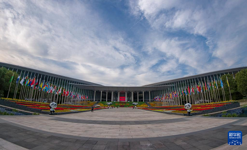 這是裝飾一新的國家會(huì)展中心(上海)南廣場(chǎng)(11月3日攝)。(新華社記者 方喆 攝)
