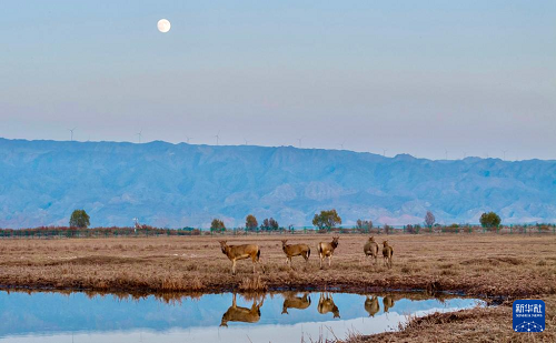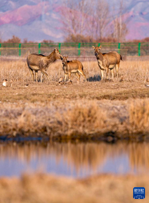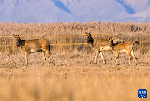 這是11月4日在寧夏青銅峽庫區(qū)濕地自然保護區(qū)內(nèi)拍攝的麋鹿和麋鹿幼崽(中)。(新華社記者 楊植森 攝)