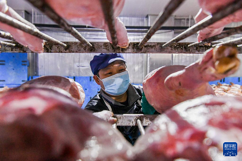 11月6日,在浙江省金華金年火腿有限公司車間內,技師在腌制火腿。(新華社發(fā) 時寬兵 攝)