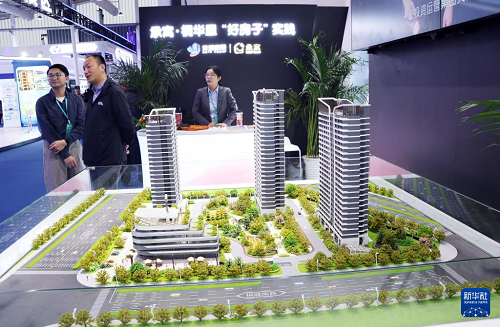 11月6日,參觀者在住博會(huì)上觀看展出的一體化民居模型。(新華社記者 潘旭 攝)