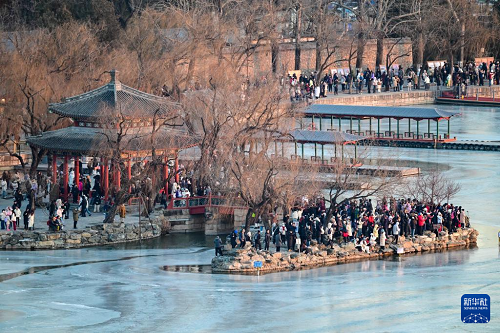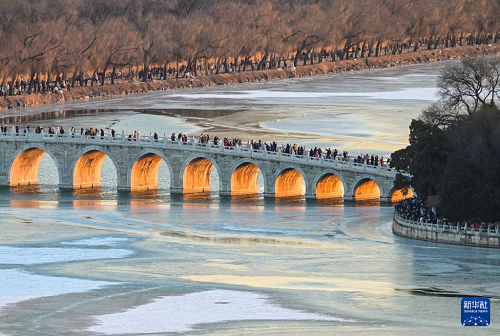 12月21日是冬至節(jié)氣,北京頤和園十七孔橋的“金光穿洞”景觀吸引了眾多游客與攝影愛好者觀賞拍攝。