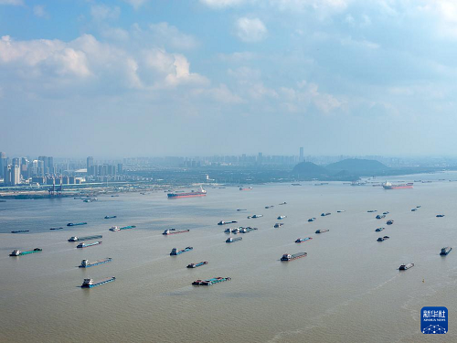 12月29日在長江江蘇南通段江面上拍攝的的眾多貨船(無人機照片)。(新華社發(fā) 許叢軍 攝)