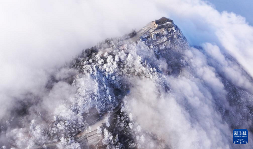 1月6日在南岳衡山風(fēng)景區(qū)拍攝的霧凇云海景觀(無(wú)人機(jī)照片)。(新華社發(fā) 曹正平 攝)