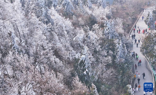 連日來(lái),湖南省衡陽(yáng)市南岳衡山風(fēng)景區(qū)出現(xiàn)霧凇云海景觀,壯美如畫(huà)的景色吸引眾多游客前來(lái)觀賞游玩。