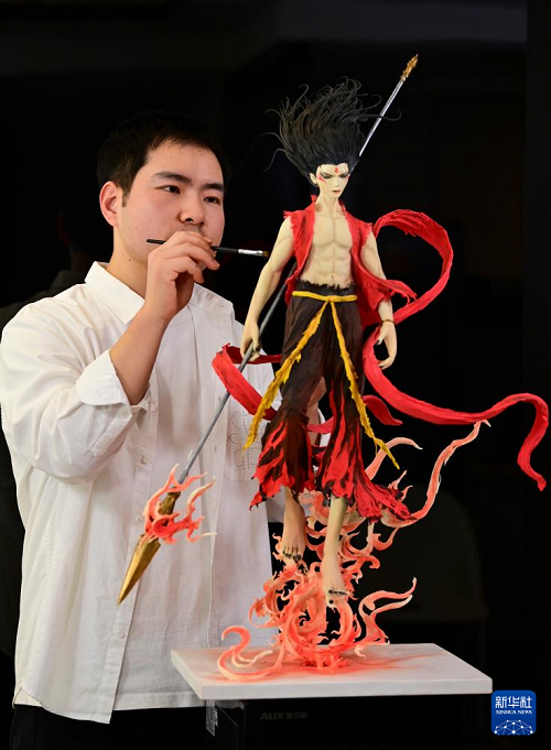 糖藝師張勃在為糖藝作品《哪吒》上色(1月13日攝)。(新華社記者 鄒競(jìng)一 攝)