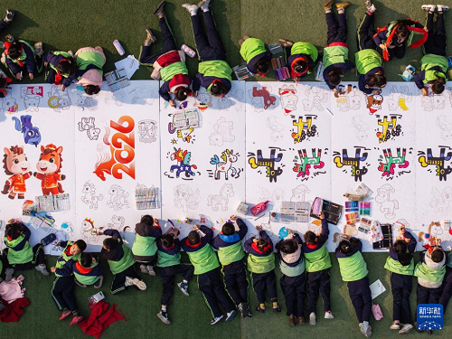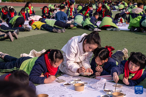 1月14日,榮縣樹人小學校的學生們在畫布上畫馬(無人機照片)。(新華社發(fā) 何海洋 攝)
