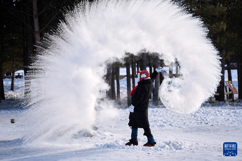1月29日,在漠河北極村景區(qū)內(nèi)的北極沙洲,游客體驗(yàn)“潑水成冰”。(新華社記者 王祚 攝)