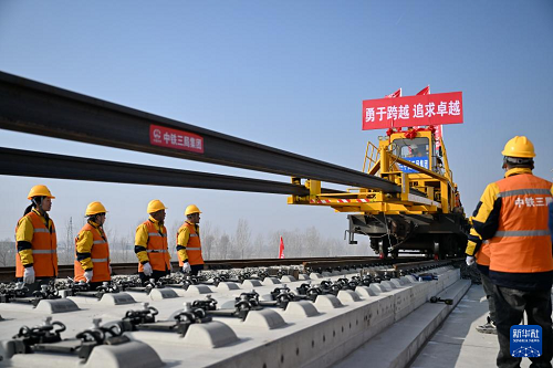 2月1日上午,在河北省保定市順平縣的雄忻高鐵建設(shè)現(xiàn)場,中鐵三局集團施工人員將首對500米長鋼軌平穩(wěn)、精準地鋪設(shè)在無砟道床上,標(biāo)志著雄忻高鐵正式進入鋪軌施工階段。