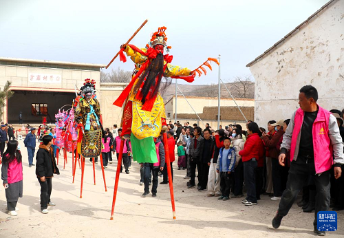2月23日,社火隊(duì)員在甘肅省平?jīng)鍪徐o寧縣李店鎮(zhèn)李店村表演踩高蹺。(新華社發(fā) 王毅 攝)