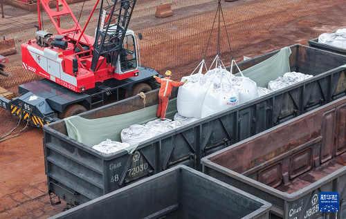 3月4日,工人在江蘇連云港港東方港務(wù)分公司碼頭鐵路裝車點(diǎn)將化肥裝上貨運(yùn)專列(無(wú)人機(jī)照片)。(新華社發(fā) 王健民 攝)