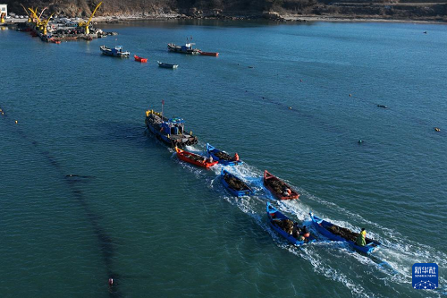 3月9日,在山東省榮成市愛倫灣海洋牧場,滿載海帶的養(yǎng)殖船駛往碼頭(無人機(jī)照片)。(新華社發(fā) 王福東 攝)