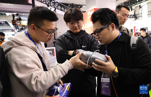 3月12日,參觀者在東方樞紐展區(qū)現(xiàn)場(chǎng)查看一只由熱塑性聚氨酯彈性體TPU材質(zhì)3D打印的可穿運(yùn)動(dòng)鞋。(新華社記者 方喆 攝)