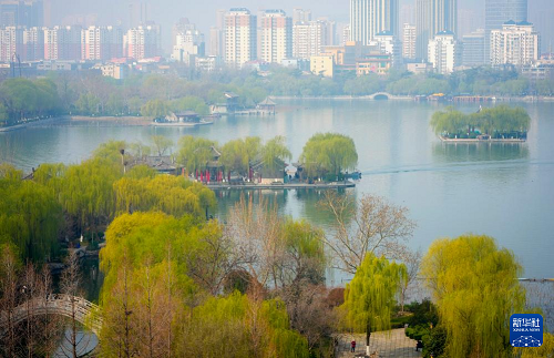 近日,山東省濟南市氣溫回升,大明湖畔的柳樹披上新綠,吸引游客前來踏春游覽。大明湖位于濟南市區(qū),湖岸種有大量柳樹,以“四面荷花三面柳,一城山色半城湖”的風光聞名。