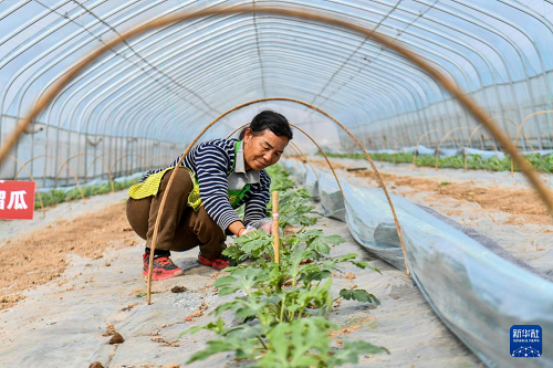 3月18日,山西省運城市夏縣夏樂精品瓜業(yè)合作社的工作人員在管護西瓜苗。(新華社記者 曹陽 攝)