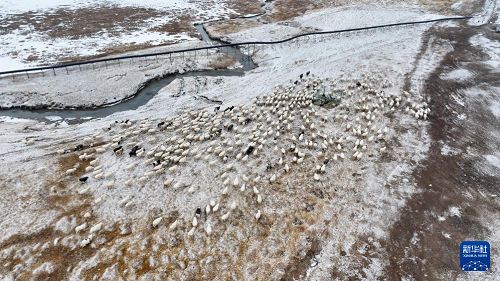 3月18日,在甘肅省阿克塞哈薩克族自治縣阿勒騰鄉(xiāng)哈爾騰村,羊群在哈爾騰河周邊覓食(無人機照片)。(新華社發(fā) 高宏善 攝)