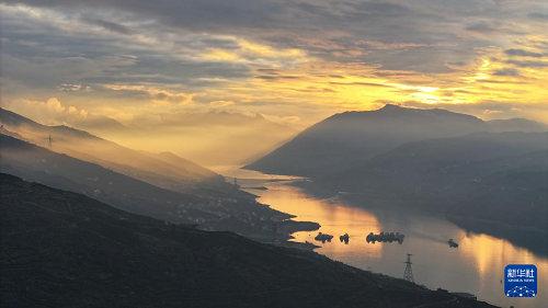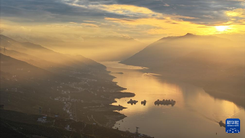 傍晚時(shí)分,落日余暉下的長(zhǎng)江重慶奉節(jié)段秀美如畫,別有一番風(fēng)味(3月24日攝,無(wú)人機(jī)照片)。(新華社記者 王全超 攝)