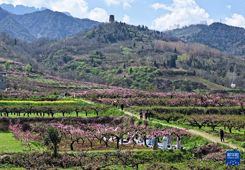 3月31日,人們?cè)谖靼彩虚L(zhǎng)安區(qū)王莽街道土門峪村桃花林中開展文化活動(dòng)。(新華社記者 邵瑞 攝)