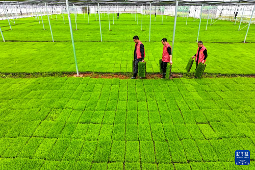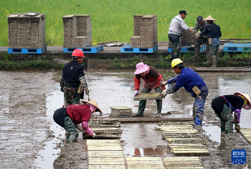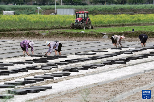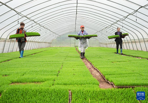 3月29日,農(nóng)民在浙江省樂(lè)清市城東街道一處集中育秧點(diǎn)轉(zhuǎn)運(yùn)水稻育秧盤。(新華社發(fā) 蔡寬元 攝)