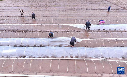 3月31日,村民在四川省眉山市仁壽縣板橋鎮(zhèn)青龍社區(qū)進(jìn)行水稻集中育秧(無(wú)人機(jī)照片)。(新華社發(fā) 潘建勇 攝)