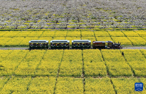 4月6日,游客乘觀光小火車從河北省晉州市周家莊鄉(xiāng)第九生產(chǎn)隊梨園旁經(jīng)過(無人機照片)。(新華社記者 楊世堯 攝)