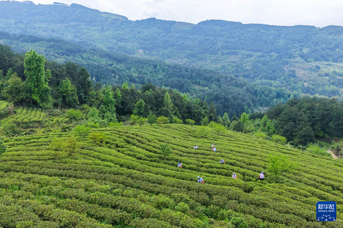 4月9日,茶農(nóng)在青龍鄉(xiāng)茶葉基地內(nèi)采摘春茶(無人機(jī)照片)。(新華社記者 唐奕 攝)