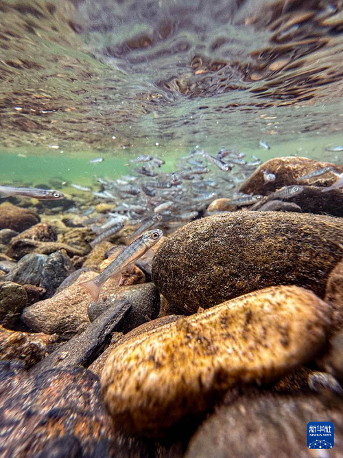 4月15日,魚(yú)苗被放流入江(手機(jī)照片)。(新華社記者 顏麟蘊(yùn) 攝)
