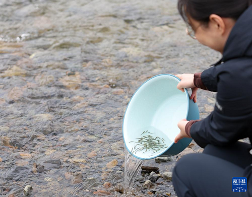 4月15日,志愿者將分裝好的魚(yú)苗放入江水中。(新華社記者 顏麟蘊(yùn) 攝)
