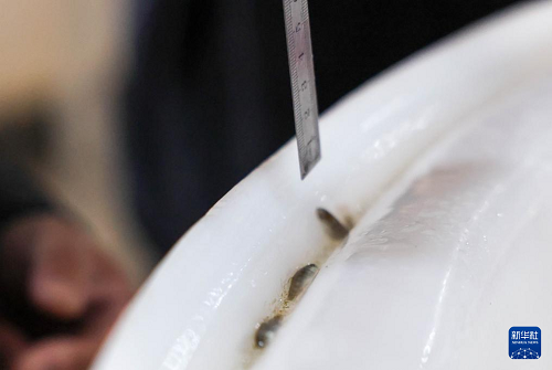 4月15日,工作人員在吉林延邊馬蘇大麻哈良種場(chǎng)繁育車(chē)間對(duì)魚(yú)苗進(jìn)行檢測(cè)、計(jì)數(shù)。(新華社記者 顏麟蘊(yùn) 攝)