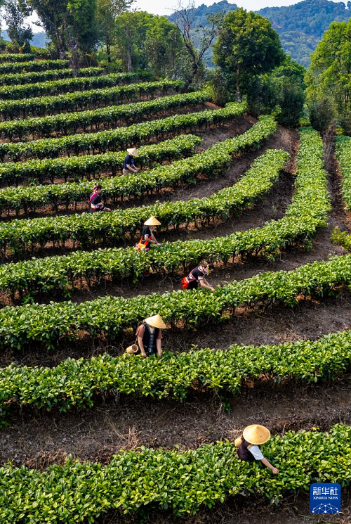 4月15日,茶農(nóng)在普洱市思茅區(qū)倚象鎮(zhèn)的茶山采摘春茶(無人機照片)。(新華社記者 陳欣波 攝)