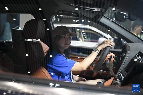 4月16日,觀眾在第六屆消博會現(xiàn)場體驗英國賓利汽車。(新華社記者 蒲曉旭 攝)