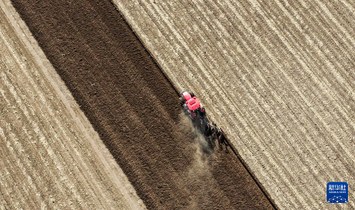 4月19日,在通遼市科爾沁左翼后旗甘旗卡鎮(zhèn),農(nóng)機(jī)手駕駛農(nóng)機(jī)翻地(無(wú)人機(jī)照片)。(新華社記者 連振 攝)
