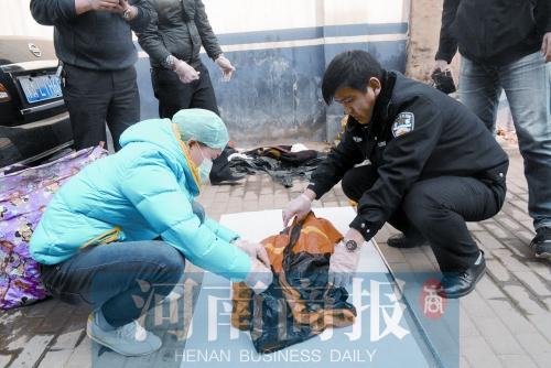 民警在被害人衣物上找線索。河南商報記者 王春勝/攝