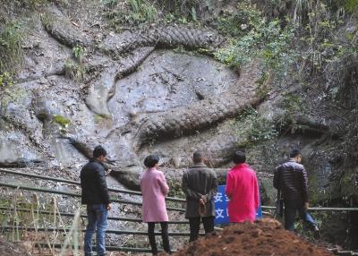 昨天,多批當(dāng)?shù)赜慰蛠淼绞埱逵倬S護(hù)工程現(xiàn)場,觀看石龍。這些游客均稱,他們是看了網(wǎng)上關(guān)于該石龍與張獻(xiàn)忠“江口沉銀”有關(guān)系的報道后,慕名前來。