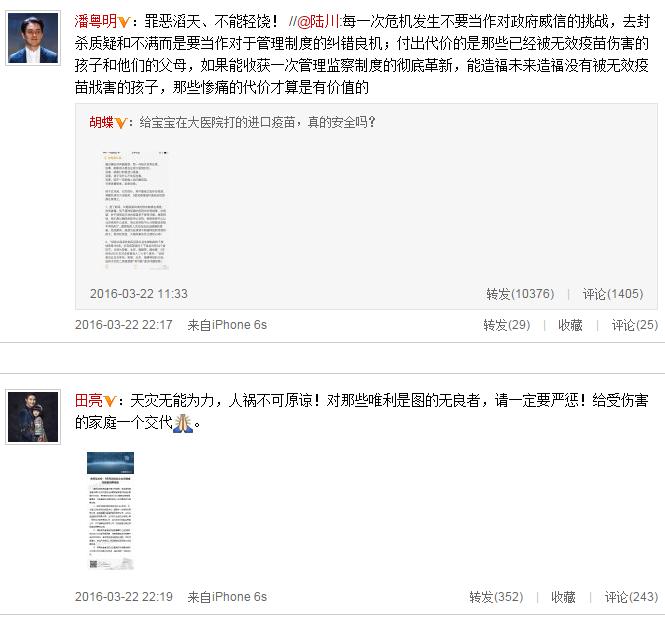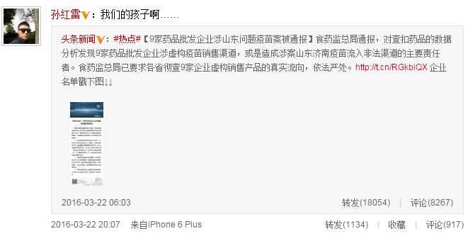 繼章子怡、賈乃亮等人在微博發(fā)聲關(guān)注疫苗安全問題后,3月22日晚,孫紅雷也在微博心痛呼叫“我的孩子……”任賢齊在微博中寫道:“請重視并嚴懲無良商人!別讓這些混蛋荼毒孩子們的健康!”舒淇、趙薇也排隊轉(zhuǎn)發(fā)并利用自身名人效應(yīng)呼吁。