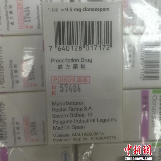 經(jīng)查驗發(fā)現(xiàn),背包內(nèi)放置著23盒嶄新的藥物,共計1.4千克。這些藥物分四排用透明塑料紙纏繞,每個盒子內(nèi)裝有一個塑料藥瓶,內(nèi)有50片藥丸。藥盒上及內(nèi)部的說明書均為外文印刷。在最外面包裝上,貼著用中文繁體字印刷的“毒藥”和“處方藥物”字樣。關員立刻查閱了藥品說明,發(fā)現(xiàn)這些藥物居然是被稱為“最強安眠藥”的氯硝西泮。