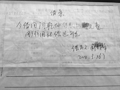 臧林峰給閆乾坤寫的“借條”顯示:“今借用閆乾坤貸款捌萬(wàn)元整,用于信用社償還利息”,落款日期為2014年3月26日。