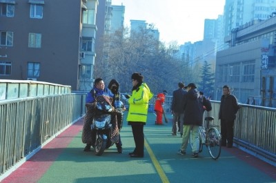 京華時(shí)報(bào)訊(記者張思佳)昨天,朝陽呼家樓交通大隊(duì)的交警在雙井橋北一過街天橋上,對在天橋上騎行電動(dòng)車者進(jìn)行處罰,騎行者當(dāng)場被罰款20元。這是交管部門首次對電動(dòng)車騎行橫穿過街天橋進(jìn)行處罰。