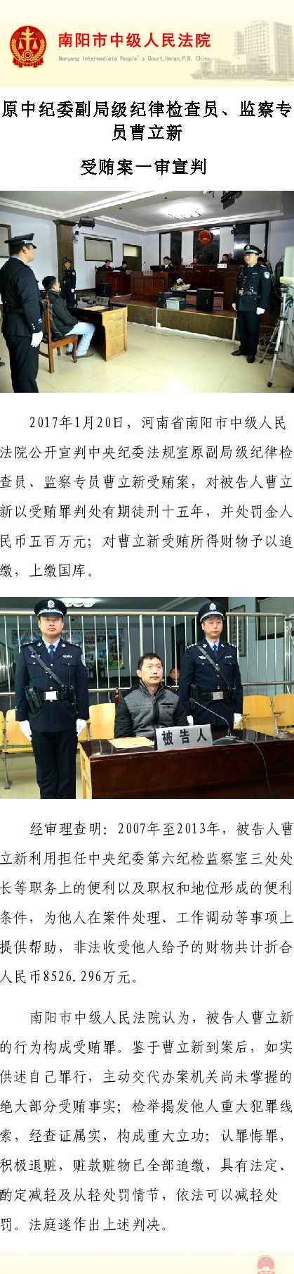 據(jù)南陽市中級人民法院官方微博消息,2017年1月20日,河南省南陽市中級人民法院公開宣判中央紀(jì)委法規(guī)室原副局級紀(jì)律檢查員、監(jiān)察專員曹立新受賄案,對被告人曹立新以受賄罪判處有期徒刑十五年,并處罰金人民幣五百萬元;對曹立新受賄所得財(cái)物予以追繳,上繳國庫。