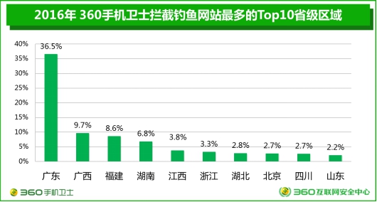 360大數(shù)據(jù)對釣魚網(wǎng)站地域分布也進(jìn)行了精準(zhǔn)分析,整體來看,手機(jī)端釣魚網(wǎng)站攔截量占比最高的地區(qū)為廣東省,以壓倒性的36.5%位居榜首;其次為廣西(9.7%)、福建(8.6%)、湖南(6.8%)和江西(3.8%)。
