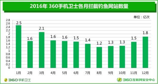 釣魚網(wǎng)站的活躍期也存在差異。360專家表示,綜合2016年各月的釣魚網(wǎng)站攔截量情況,可以看出全年的釣魚網(wǎng)站活躍程度呈現(xiàn)中間低、兩頭高的特點(diǎn)。1月份釣魚網(wǎng)站攔截量最高,達(dá)到2.5億,8月最低(1.2億次)。